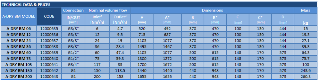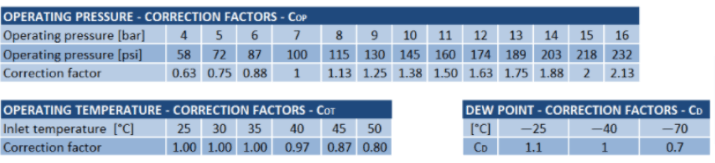 (¹) Refers to 1 bar(a) and 20 °C at 7 bar operating pressure , inlet temperature 35 °C and pressure dew point at outlet —40 °C (²) Outlet flow refers to typical assumption during regeneration phase for operating at nominal inlet flow conditions. Outlet flow includes average air losses of approximately 17,3 %. * If dryer is supplied without inlet filter compressed air class 1 (ISO 8753-1) for solid particles and oil should be provided to the inlet of the dryer.